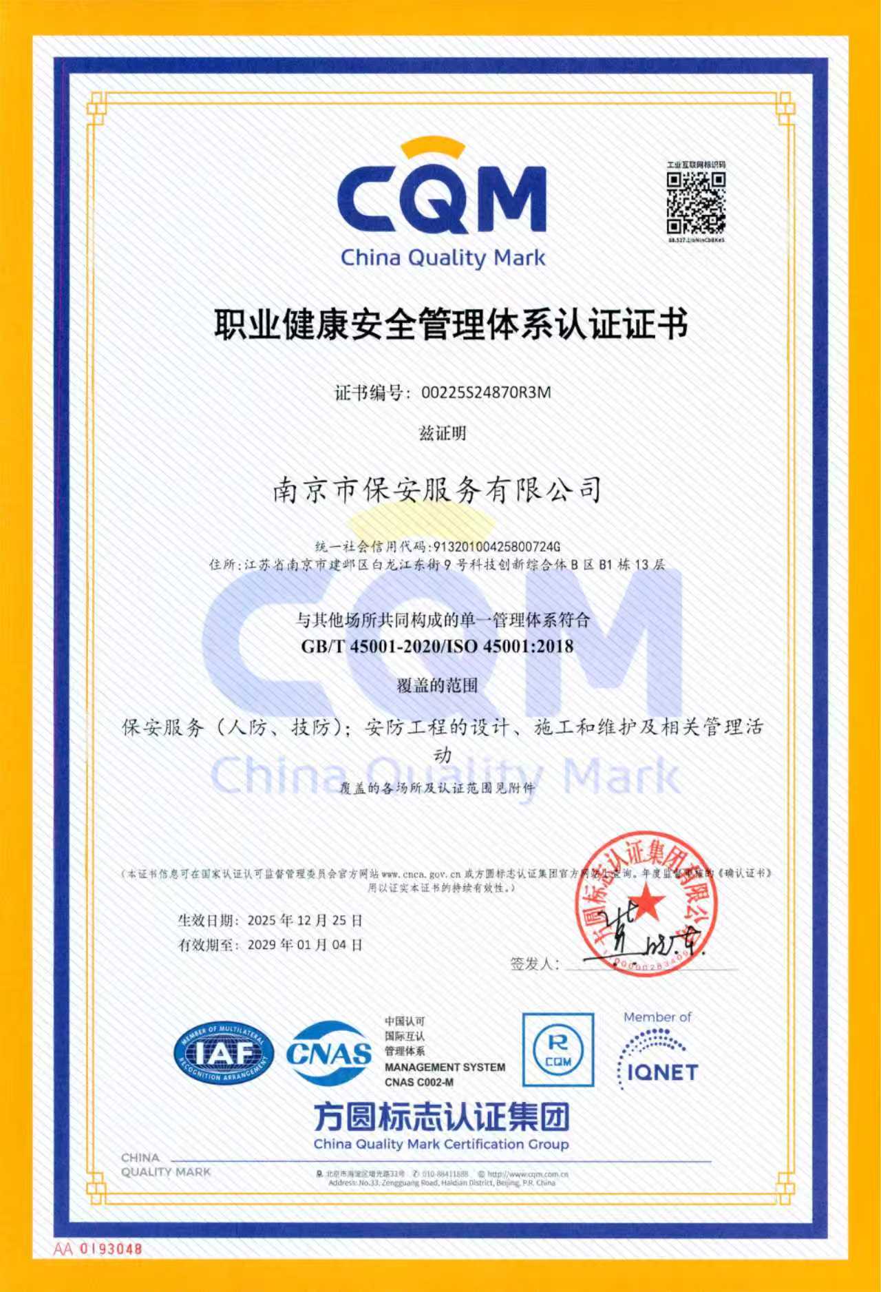職業(yè)健康安全管理體系認(rèn)證證書
